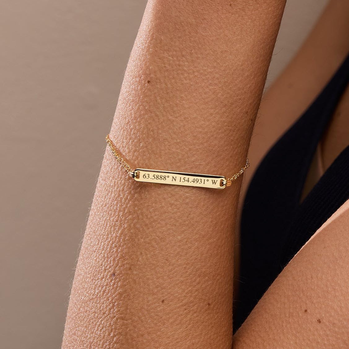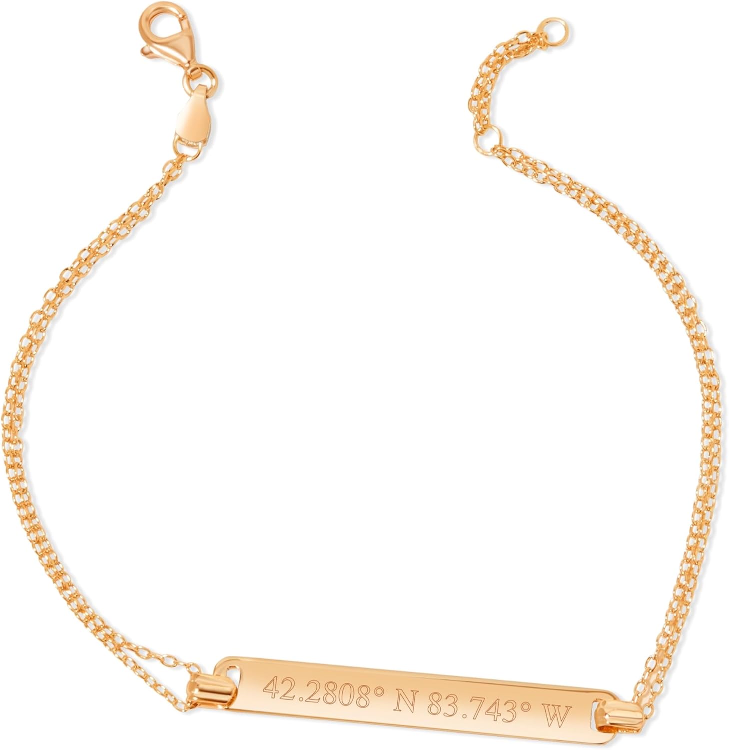 We all have that special location that holds significant value to us. It might be the address of your home, the spot where you met your significant other, or the location of a special moment. With our Custom Coordinate Gold Name Bar Bracelet, you can preserve that special spot forever. Feminine and dainty but also strong and durable, it’s the ideal piece of jewelry for any gift-giving occasion. In addition to treating yourself to this custom identification bracelet, why not give one away as a gift? Coordinate jewelry is a unique and unexpected way to show someone that you care. Great as an engagement, wedding or even a friendship gift. Highlight the location of a college or university, making it the ultimate graduation gift. This bracelet is perfect for any occasion, from birthdays and special events to holidays such as Christmas or Valentine’s Day. It also puts a sweet spin on the traditional bridesmaid’s gift! While you can find other types of personalized jewelry and gold bracelets that showcase names or dates, this longitude latitude bracelet is a unique twist on traditional monograms or initials. It acts as a sort of secret code, commemorating a memory in terms that only you or your recipient will understand. This engraved bracelet your new go-to way to express your admiration, love, and respect. Our Custom Coordinate Gold Name Bar Bracelet is made from stunning gold-plated 925 sterling silver. Only weighing around 2.66 grams, it feels lightweight and comfortable on your wrist so you can wear it every day. In all, the bracelet measures 7 inches by 1.38 inches, and the gold name bar is 1 and 3/8 inches by ¼ inches. It features an exquisite Rolo double chain and a secure lobster-claw clasp. You can adjust the clasp slightly to achieve the perfect fit. In addition to gold, this bracelet is also available in rose gold and silver. All of our jewelry orders ship in a special black gift box at no extra charge.