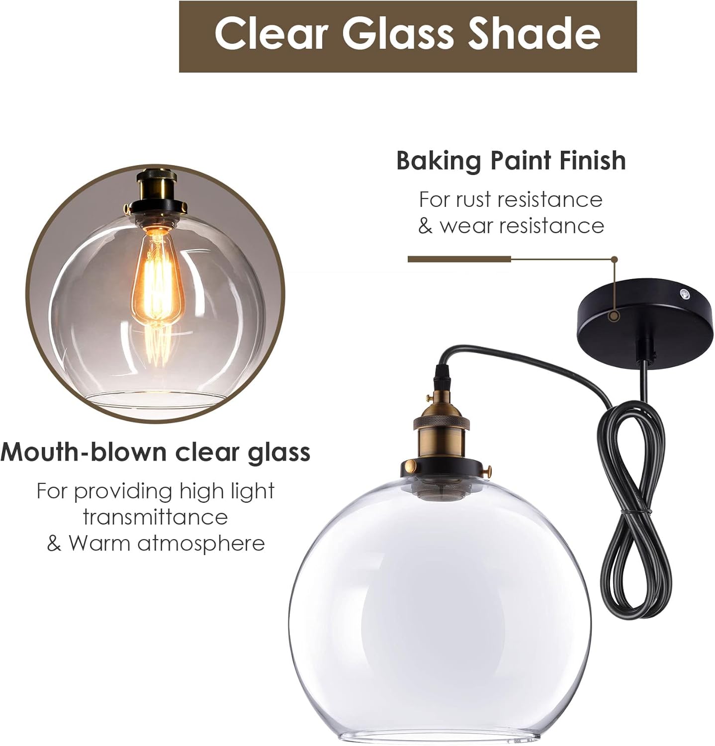 Features:- Industrial & Vintage - 10" Transparent glass ceiling light features ball shape and golden bronze lamp holder and it can be used with an Edison bulb or other vintage bulbs to bring industrial and retro style for home and commercial use, matching well with other industrial décor and showing your unique taste- Clear Glass Shade - Lamp shade is made of mouth-blown clear glass to provide high light transmittance, large lighting range and create vintage & warm atmosphere for your home; durable and smooth glass surface for easy cleaning and maintaining- Easy & Flexible Installation - Includes expansion bolts for installing on concrete ceiling and self-tapping screws for installing on wooden ceiling, suitable for you to mount on different ceiling; 59 1/16" adjustable power line can be easily adjusted according to the ceiling height- Quality Assurance & Great Compatibility - CE certificated bulb holder and UL certificated power line for guaranteeing operation safety; bulb holder is compatible with standard E27 bulbs (LED, CFL, incandescent or halogen), max light power is up to 60W- Wide Application - Perfect fitting for traditional and modern decor style; ideal for using in hallway, dining room, kitchen, bedroom, living room, farm house, restaurant, bars, etcSpecifications:- Lamp Shade Diameter: 9 13/16" (25 cm)- Lamp Holder Dimension(Dia.xH): 1 9/16" x 4 5/16" (4 x 11 cm)- Base Dimension(Dia.xH): 3 15/16" x 7/8" (10 x 2.2 cm) - Power Line Length: 59 1/16" (1.5 m)- Voltage: 100 to 240V- Bulbs: 60W, E27 (Not Included)- Color: Transparent- Net Weight: 2.8 Lbs (1.27 kg)Package Contents:- 1x Glass Lampshade- 1x Bulb Holder- 1x Base- 1 Set of Installation Tool (2x Expansion Bolts, 2x Wire Connectors, 2x Self-tapping Screws)- 1x ManualNotice: - Notes: The bulb as shown in photos is not included.