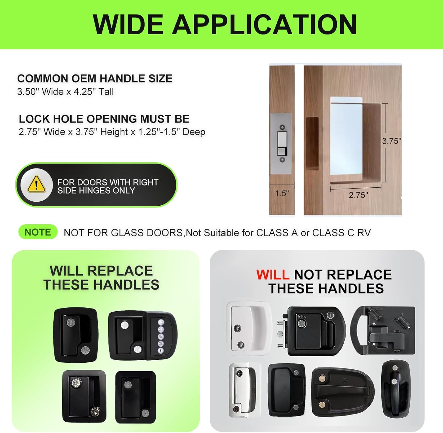 | Recommended Uses For Product | 2.75" Widex3.75" Height × 1.5" Thick lock hole openings, DOES NOT FIT CLASS A OR CLASS C RVs, NOT FOR GLASS DOORS, RV Door Lock |