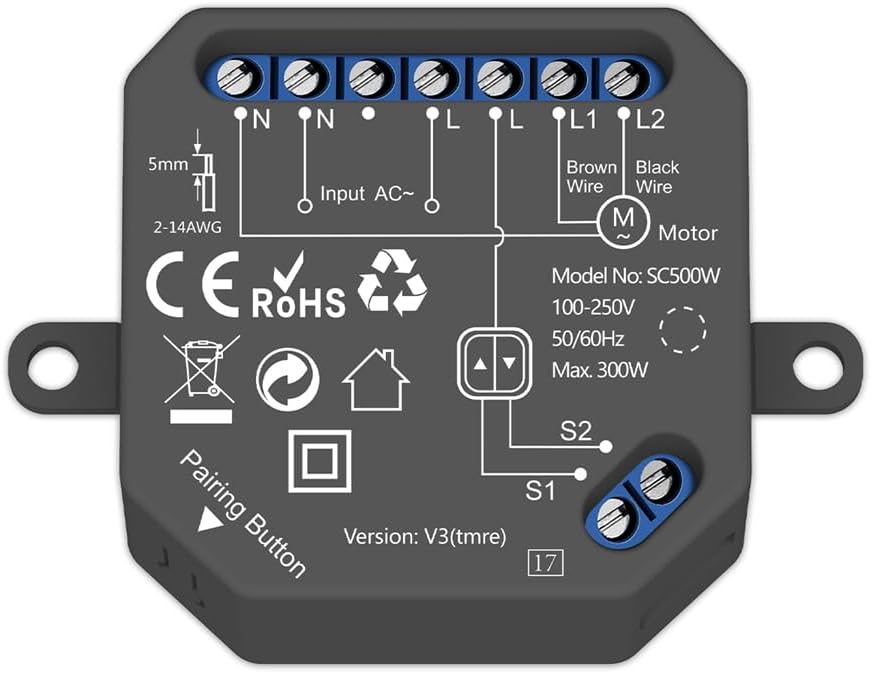 Origin:Mainland ChinaCertification:CE,RohsApp Name:Tuya, Smart LifeApp Type:Free App, Support Android And IOSWireless Protocol:2.4Ghz Wi-Fi(Not Support 5Ghz Wi-Fi),Tuya Zigbee 3.0Works With:Tuya Zigbee HubSupport:Hands-Free Voice ControlColor:gray9 / Yellow / Brown / OrangeWorks With:Classic 4 Wires AC MotorCompatible With:Tubular Motor With 4 WiresPlastic Material:Fireproof ABSCertification:CE, RED, EMC, RohsNote before order! The WiFi version of the curtain switch module does not require a gateway to be used. ZigBee curtain switch module need work with Tuya ZigBee Hub, please make sure you already have a Tuya ZigBee Hub, if not, please buy the Tuya ZigBee Hub in this listing. This ZigBee curtain switch module can't work with other brands' ZigBee Hub, please make sure your ZigBee Hub is from Tuya. Input Voltage: 100~250VAC, 50/60Hz;Output Voltage(Motor Voltage): 100~250VAC, 50/60Hz(Our switch can't work with DC motor!) Please check your motor is with 4 wires (Blue Wire, Brown wire, Black Wire, Green/Yellow Wire) before you buy our curtain switch module. And please be noted that neutral wire is a must for the installation, or you can't use our device. App Remote Control: Support Smart Life APP /Tuya APP. Voice Control: Voice control can be achieved through smart home devices (speakers). ZigBee Remote Control: Use a ZigBee Remote to control the curtain blinds. Running Time Setting: The running time can be set from 1-120 seconds, suitable for the use of large blinds. Wall Switch Control: After you install this module, your wall manual switch still works, it can open , or close the shutter. Tuya ZigBee Mesh: It has a stable network performance with zigbee 3.0 mesh technology. Timer and Schedule: You can set a timer to open or close the curtains at a specified time.