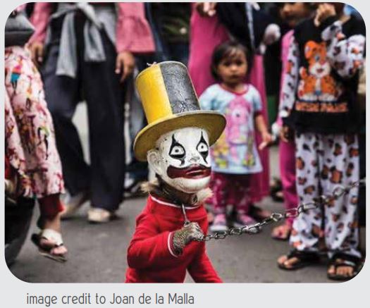 Tina, an 8 year old girl is taking a walk around her neighbourhood with her parents. From a distance, there is the loud sound of beating drums and the area is surrounded by children her own age. A long tailed monkey is wearing a mask and dancing, while holding an umbrella in its right hand. Unlike her friends, who are laughing at the monkey, Tina feels sad to see the chain around that monkey. While continue watching, she asks her mom, “Mom, why does the monkey has to be chained and dragged around? Isn’t that cruel?