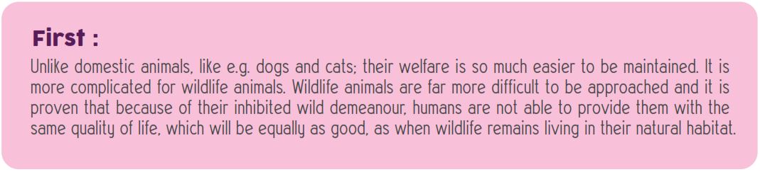 n the end, there is no better home for wildlife animals than their own natural habitat. We could support their sustainability by taking care of the animal environment around us. Avoid the capture of wildlife animals, which can cause them any harm. Let’s start doing good things and have empathy for wildlife animals by sharing this knowledge to our families and friends